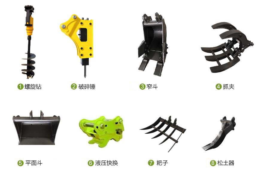 1.8T挖掘機(jī)還可以搭配螺旋鉆、抓夾、耙子、松土器、窄斗等屬具使用,滿(mǎn)足不同的施工場(chǎng)合。
