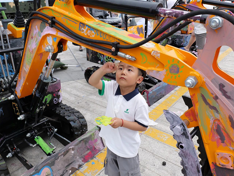 2、創意涂鴉賦能工業,引爆話題:小藝術家們揮灑水彩,將充滿想象力的涂鴉藝術與海拓機械的硬朗工業風完美融合,色彩斑斕的圖案跳躍在鋼鐵巨獸之上,瞬間柔化了工業產品的棱角,繪就了一道獨特亮麗、極具反差美的風景線,創造出專屬于六一兒童節的“限量款”藝術挖機。